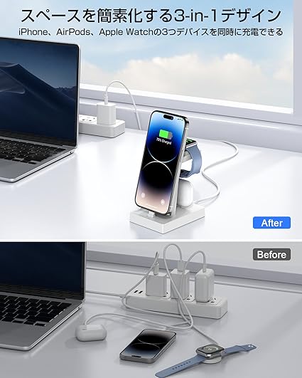 【27W急速充電スタンド】 iPhone・AirPods・Apple Watchの3デバイスを同時に充電可能!アイフォン純正ケーブルと同等の高速充電を実現し、i-Phoneは最大27W、Apple Watchは2.5W、AirPodsは5Wで効率的に充電できます。複数の充電器を使う手間を省き、シンプルで快適な充電体験を提供します。