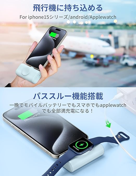 RORRY モバイルバッテリー 小型 直差し【TYPE-Cコネクター一体型・iPhone16/15 とiwatch同時充電・102g超軽量】5000mAh アップルウォッチモバイルバッテリー 3A急速充電 3台同時充電 コンパクトで持ち運び便利 パススルー充電 コードレス iPhone 16/15シリーズ/applewatch ultra2/10/9/8などに対応 津波/台風/防災グッズ a