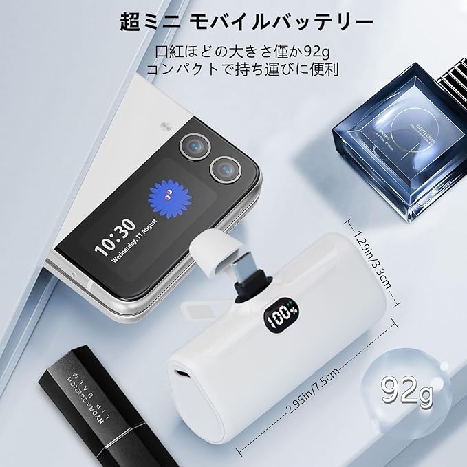 LUCKYDUO モバイルバッテリー 軽量 小型 5000mAh Type-Cコネクター内蔵 コードレス コンパクト 直接充電 急速充電 LCD残量表示 LEDライト&スマホホルダー付き Android用iPhone16/15/Xperia/Galaxy/Pixel/HUAWEI/ゲーム機など充電対応 PSE認証済(ホワイト) a