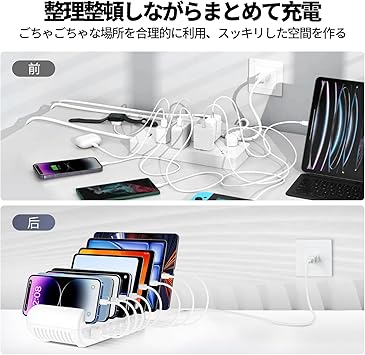 【8台同時充電】この8口スマホスタンド充電ステーションは、8台のデバイスを同時に充電でき、複数の充電器が不要で、コンセントが不足したりデスクトップが散らかったりすることを心配する必要がありません。 卓上充電収納ステーションとして、見苦しく散らかっていたコードを綺麗に片付けてくれます。またコンパクトで会社、オフィス、会議室、家、居間、寝室、台所、ホテル、レストラン、教室に場所を取らずにすっきりとまとまります。
