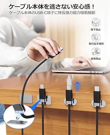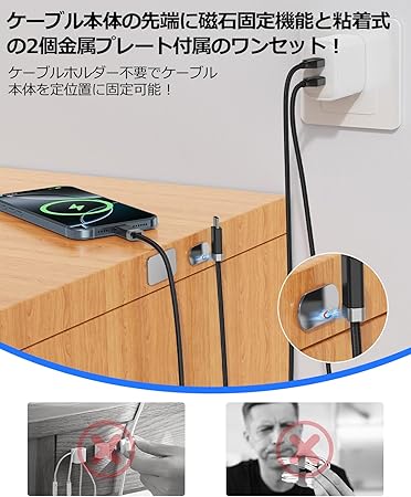 『粘着式の金属プレート2個付属、設置場所も自由自在!』磁石に付く先端type-cケーブルは直接に金属製の机に貼り付け収納可能!また、タイプcタイプcケーブルは粘着力抜群の金属プレート(跡が残らな