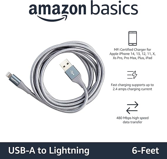 Amazonベーシック USB-A -ライトニングケーブル 高耐久ダブルナイロン iPhone充電 Apple MFi認証 iPhone 14/13/13 Pro/12/SE(第2世代)/iPad 各種対応(1.8m ダークグレー) a