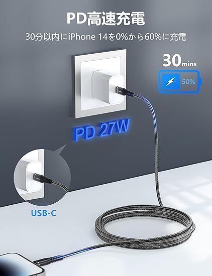 【PD ケーブルライトニング】USB C lightning ケーブルは3Aまでの高出力に対応しています。PD対応のUSB-C急速充電器と一緒に使用することで、わずか30分で50%まで充電することができます。