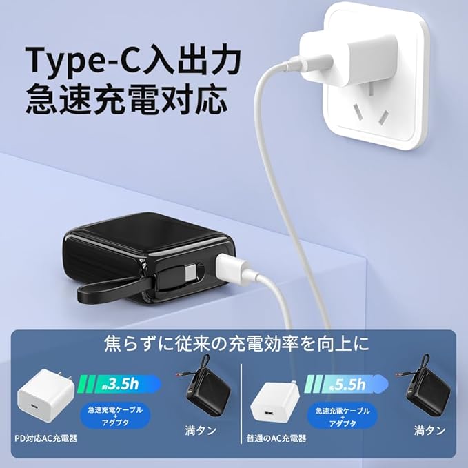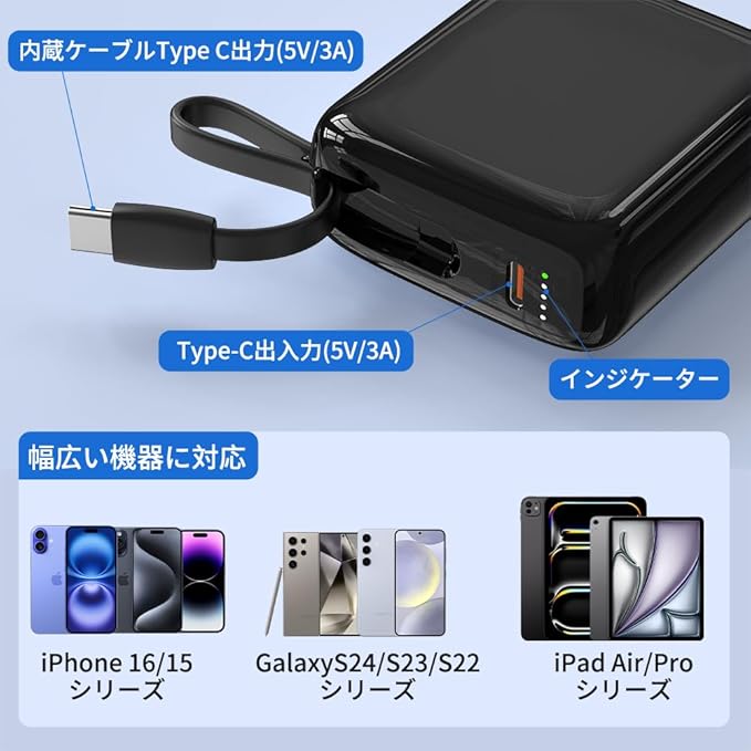 【Type-Cケーブル内蔵】ほとんどのスマートフォンに手軽に充電できる上に、さまざまな煩わしい充電線を持ち込む必要がなく、モバイルバッテリーの内蔵ケーブルは出力と入