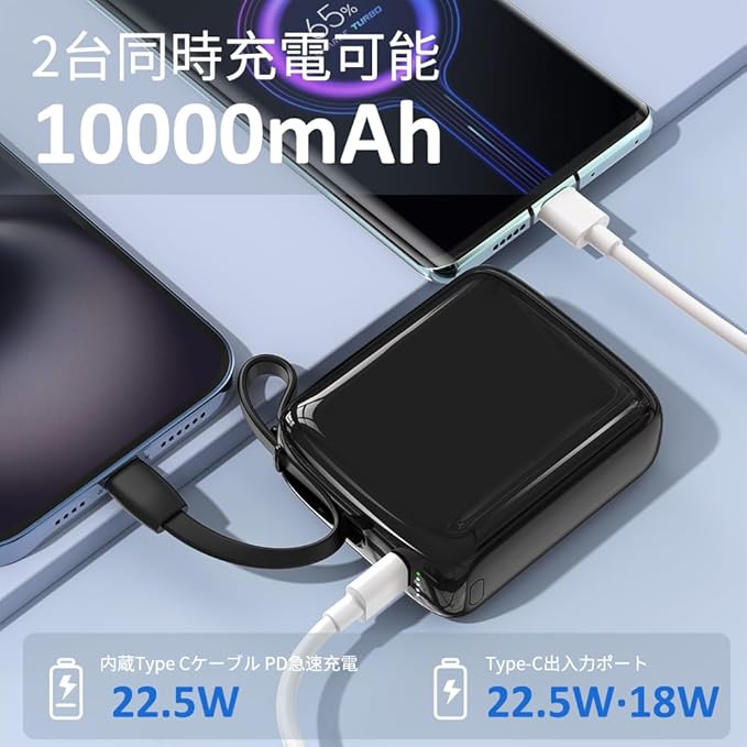 モバイルバッテリー 軽量 小型 タイプC 10000mAh ケーブル内蔵 PD22.5W急速充電 QC 3.0 Type-C出力/入力ポート コンパクト かわいい 人気 166g 持ち運び便利 超軽量 2台同時充電 携帯充電器 PSE認証済 LEDディスプレイ アウトドア/災害の必需品 iPhone16/15/14&Androidに対応 (ブラック) a