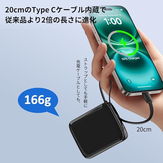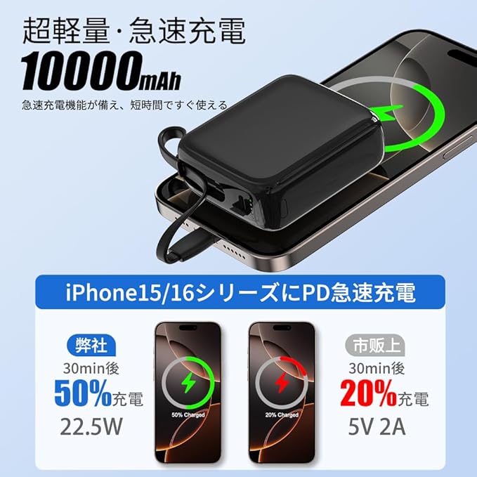 【超軽量の10000mAh 携帯充電器】重量わずか166gの軽量モバイルバッテリーはポケットやバッグに簡単に収納できます。 ケーブルが内蔵されており、比類のない携帯性を体験できます。 iPhone 16を2回、Samsung S24を1.7回、iPad Airを1回充電でき、スマートフォンやその他の電子機器に一日中電力を供給します。