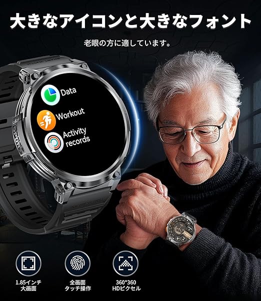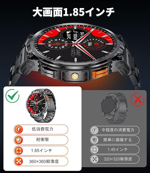 【1.85インチの大画面とLED懐中電灯機能】このAndroid対応のスマートウォッチは、1.85インチの大画面IPSディスプレイ