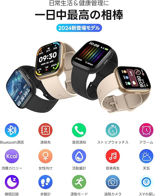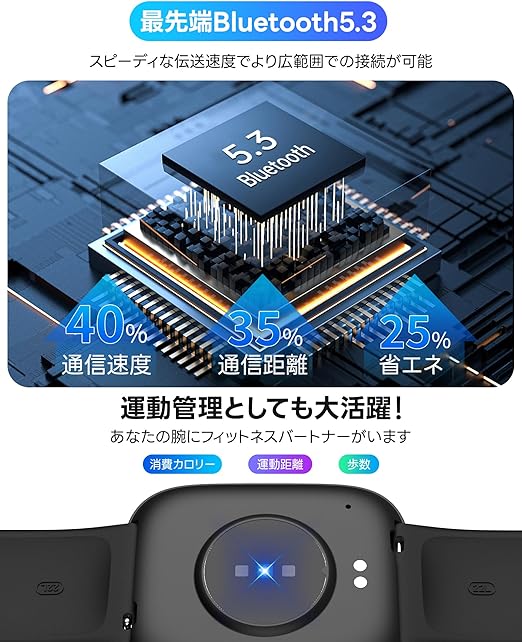 【Bluetooth 5.3通話&メッセージ通知】このスマートウォッチは、最先端のbluetoothバージョン5.3を採用することで、リンク状態でのエネルギー消費量を低減し、スマートウォッチの持続時間を延長しています。また、SMSやメッセージ通知(Facebook、Line、Instagram、Twitterなど)も受け取れます。様々なアプリからの通知を即座に確認でき、重要なメッセージを逃しません。iOSおよびAndroidスマートフォンと互換性があります。大容量バッテリー内蔵され、一度の充電で