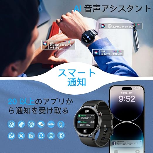 【通話機能付き&DSPオーディオチップ搭載】 ★スマートウォッチをタップするだけで通話可能であり、キーパッド付で電話をかけることができます、電話帳の作成、着信履歴の記録、更に、この便利性にDSPオーディオチップを搭載、安定性に高性能を加えます‥★「DSPオーディオチップって?」--DSPを搭載したら、複雑なアナログ回路だと、回路内でどうしても発生しがちなノイズや音質劣化とは全く無縁で、低ノイズで劣化の少ないエフェクト音が得られる。そこで、より安定、より速い、より高音質な通話体験を提供いたします。