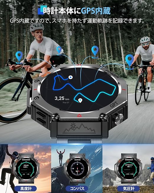 【高度気圧計測機能&方位磁針&100+種類運動モード&GPS搭載のスポーツウォッチ】このスマートウォッチは高度気圧計測機能が付き、登山の時にリアルタイムの高度と気圧を確認できます。コンパスも付いているので万が一道に迷ってしまった時などに備え、登山やハイキングの際には携帯すべき必需品です。また、このスマートウォッチはランニング、ウオーキング、サイクリングなど約100種類のスポーツモードが搭載され、アプリと接続すれば、運動距離、時間などデータを記録できます。GPS内蔵ですので、スマホを持たず運動軌跡