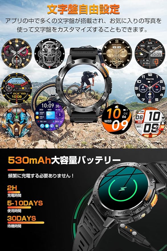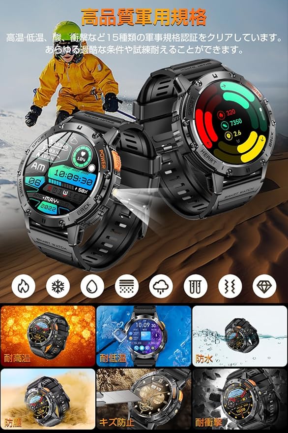 【1.43インチAMOLED高精度画面&軍用規格】本製品は1.43インチの高精細AMOLEDディスプレイを採用し、466×466の高解像度で鮮明で美しい画面表現を実現。直射日光下でもクリアな視認性を確保しています。軍用規格の金属フレームは高い耐久性を誇り、長期間使用しても剥がれや変色が発生しません。さらに強化されたスクリーンは熱帯雨林から極寒の氷河まで、あらゆる過酷な環境に耐える頑丈な設計で、アウトドアスポーツに最適なスマートウォッチです。