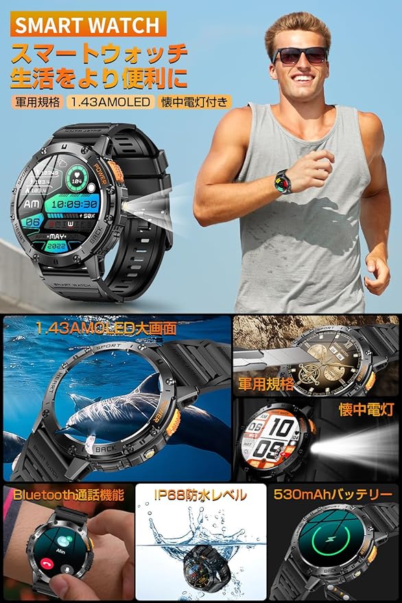 スマートウォッチ 【2025革新モデル 軍用規格&防水防塵耐衝撃】1.43インチAMOLED高精度画面 懐中電灯付き 通話機能付き 530mAh長持ちバッテリー iphone対応 アンドロイド対応 メッセージ通知 音楽再生 音声アシスタント 腕時計 100+種類運動モード Smart watch スポーツウォッチ 文字盤自由設定 天気予報 メンズ レディース a