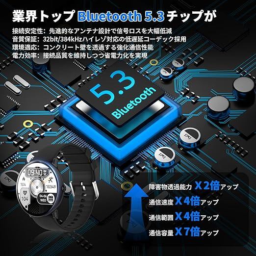 【通話機能付き・着信通知・カレンダー付き】スマートウォッチはBluetooth 5.3技術を搭載し、従来品よりデータ転送速度が2倍アップ、通信範囲が4倍