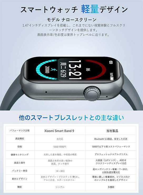 【スマートウォッチ ? 最新モデル ナロースクリーン】ビジネス/スポーツ兼用の多機能ウェアラブル(スマートウォッチ)。2025年Q2期:Amazon Japan「スポーツウォッチ部門」売上TOP3,主要フィットネスクラブ20社採用。主な特長:1.47インチHDディスプレイ/運動モード/健康管理/業界最長クラスの駆動時間/IP68防水/超軽量ボディ/日本語専用アプリ...デザインコンセプトは類似の時計よりもユーザーフレンドリーであり、より便利かつ迅速に選択できます。音声アシスタントにも対応している