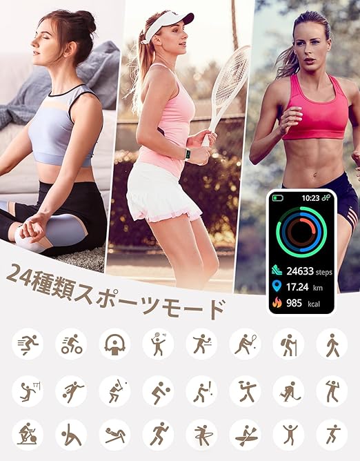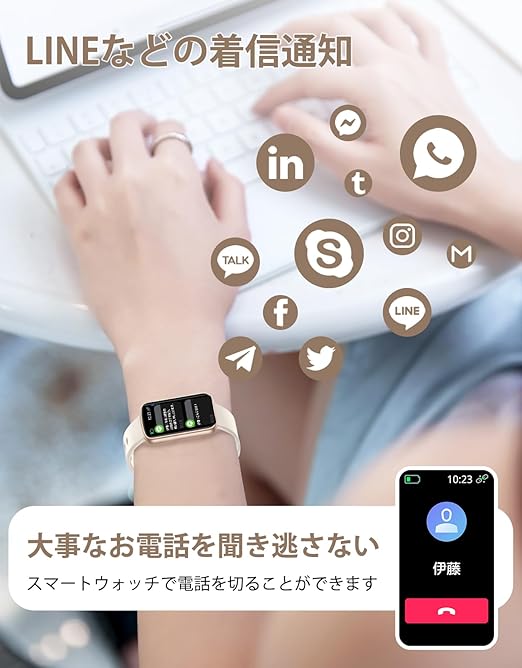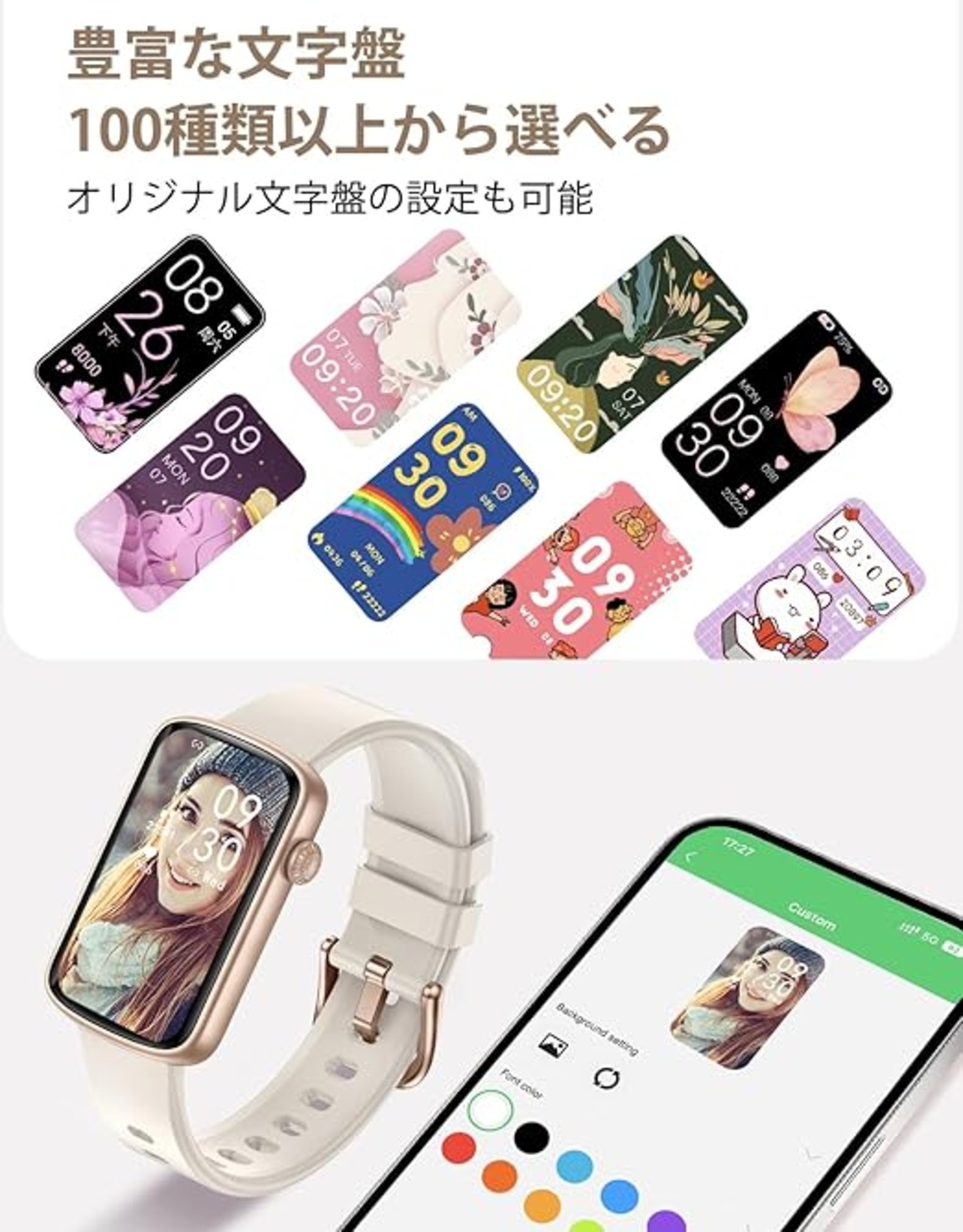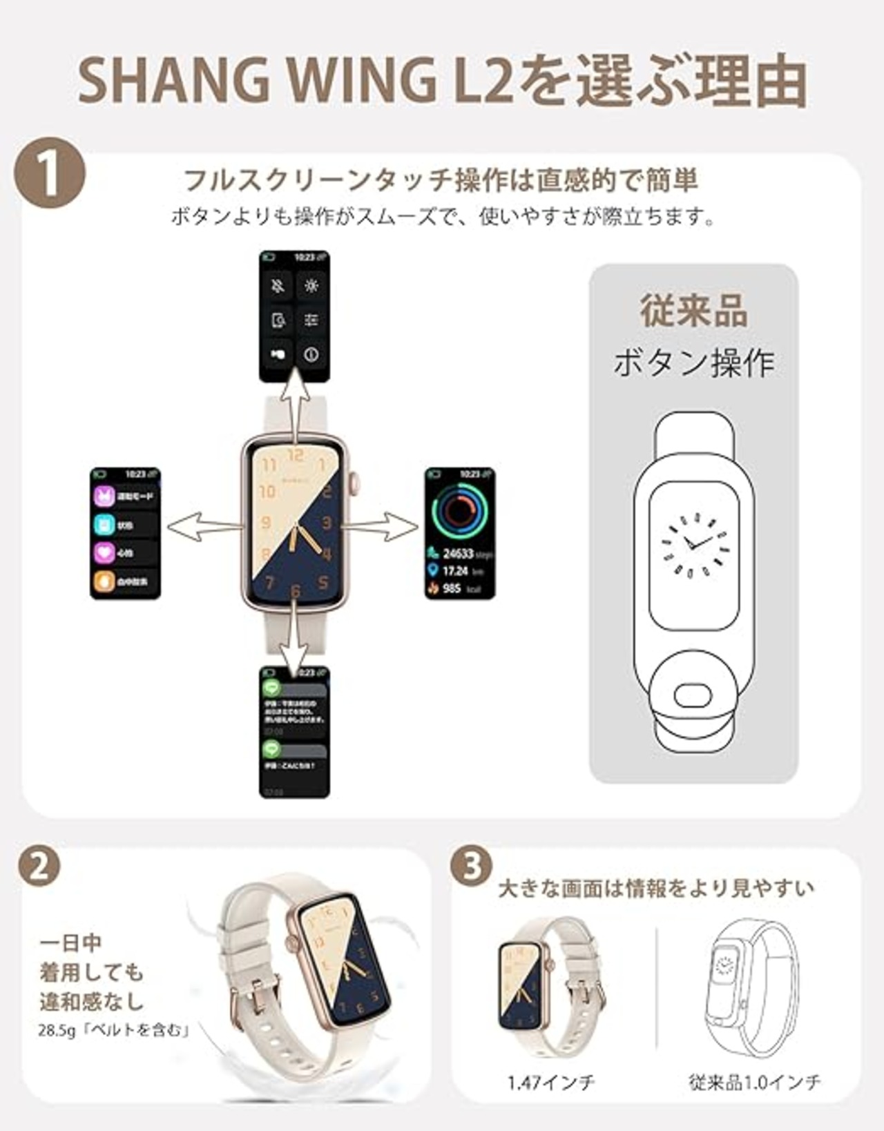 「1.47インチ・超軽量・使いやすい」スマートウォッチL2は、1.47インチの?長方形のスクリーンを搭載し、解像度は170×320で、文字がクリアで読みやすくなっています。男女兼用で、バンドを含めた重量はわずか28.5gで、一日中付けていても違和感を感じません。タッチスクリーン操作で、アプリ「GloryFit」に接続すれば、簡単に使うことができます。また、このスマートウォッチは、多様なシーンで活躍できます。スポーツ時には運動データを記録し、日常生活管理に役立ちます。ビジネス時には、通知を受け取っ