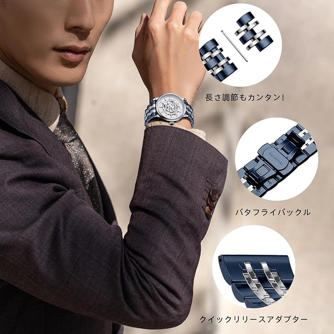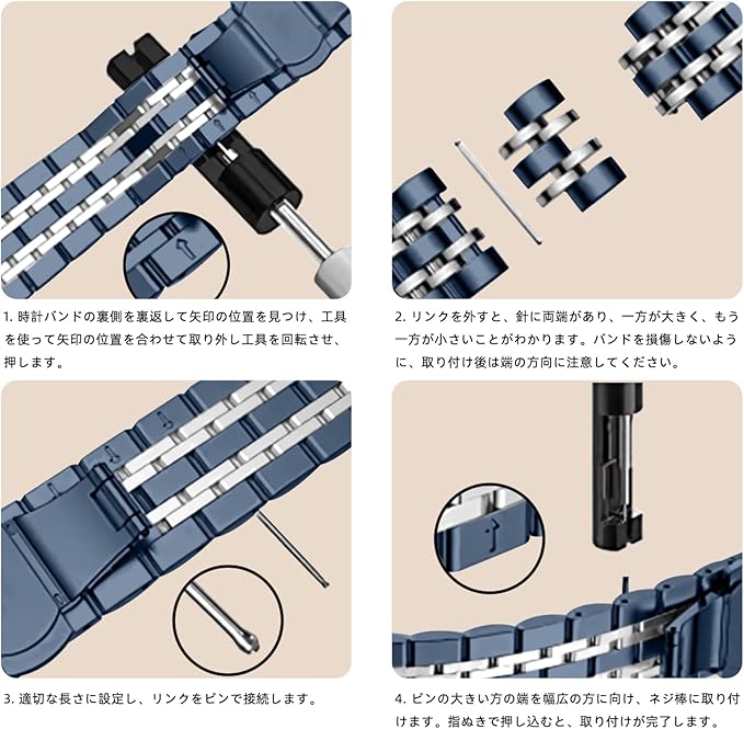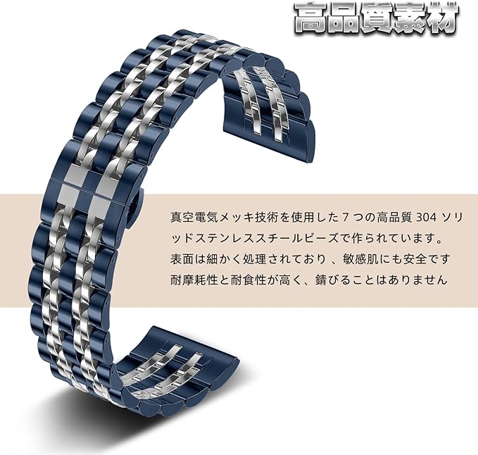 金属素材: 弊社の金属製バンドは高品質の304ステンレス鋼で作られており、真空メッキにより光沢があり、錆びにくく、通気性があり、敏感肌にも安全です。長期間使用しても金属臭がなく、直接水で濯ぐことができます。