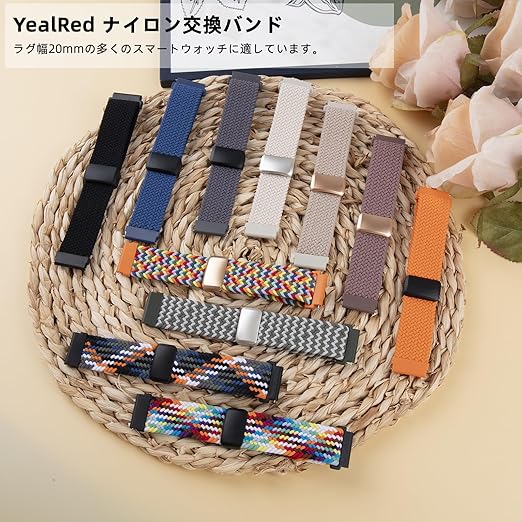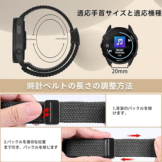 【対応機種】YealRed ナイロン交換バンド For Garmin Forerunner 570 42mm/Vivoactive 6 / 5 / 3 / 3 Music/Forerunner 165 / 165 Music/ 245 / 245 Music/ 645 / 645 Music/Approach S50 /Approach S44 対応、20mmサイズのスマートウォッチに対応、ご購入前に時計のラグ幅と時計のサイズが適切かどうかをご確認ください。(注:スマートウォッチは含まれていませ