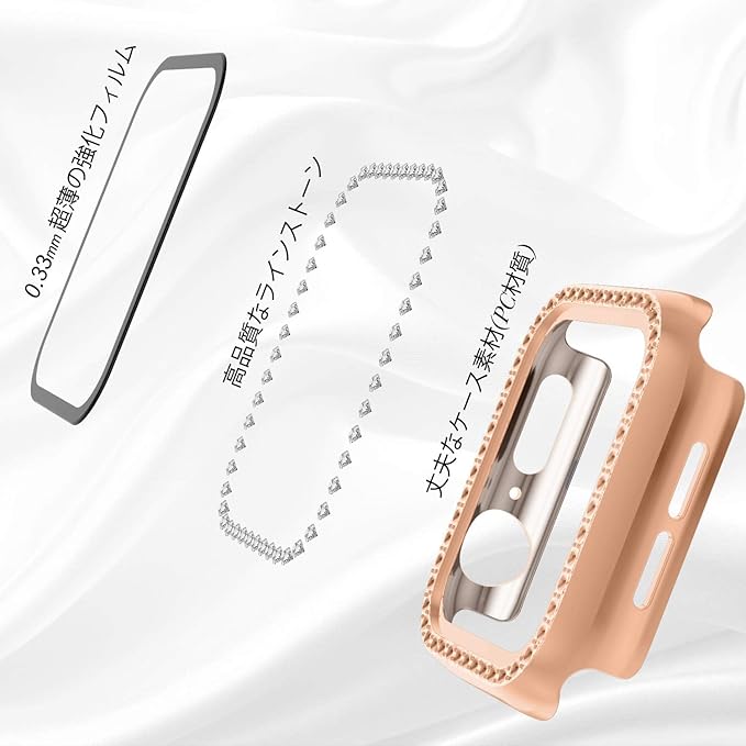 「WASPO AppleWatch ダイヤ付き保護ケース」とは、Apple Watchシリーズ10の42/46mm、シリーズ9/8/7の41/45mm、シリーズ6/5/4/SEの40/44mm、シリーズ3/2/1の38/42mm,、女性専用に設計されて、スクリーンプロテクター(強化ガラスフィルム)付きのAppleWatchラインストーン式保護ケース。