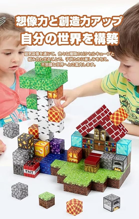 【磁石内蔵設計】このブロックセットは遊び時間を魔法のような創造的な冒険に変えます。マグネットキューブに超強力磁石が入っています、どの面もほかの面にもカチッと音を立てて接着します。従来の木製積み木よりも組み立てが簡単で、子どもたちに夢中になるような新しい遊び方を提供します。ブロックを思いのままに組み合わせて、ゲームでおなじみの場面を再現できる新しい遊びの形です。