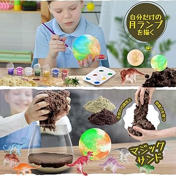 【自分だけのミニチュアキットを作ろう】このおもちゃは子供たちに向けた魅力的な工作キットで、恐竜テーマのミニチュアと描ける月ランプが特徴です。恐竜好きな子供たちにとって、このキットは夢中になること間違いなしです。様々な恐竜ミニチュアが提供しています、子供たちは自分が思う中生代の世界が構築できます。2色のサンドや苔を使って地形を作り上げ、恐竜の