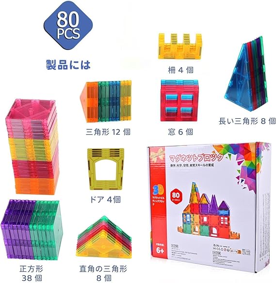 マグネットブロック 80 ピースの磁石タイル マグネットおもちゃ STEM 学習用 教育建設玩具 6歳以上の男の子 女の子 教室や幼稚園 誕生日ギフト a