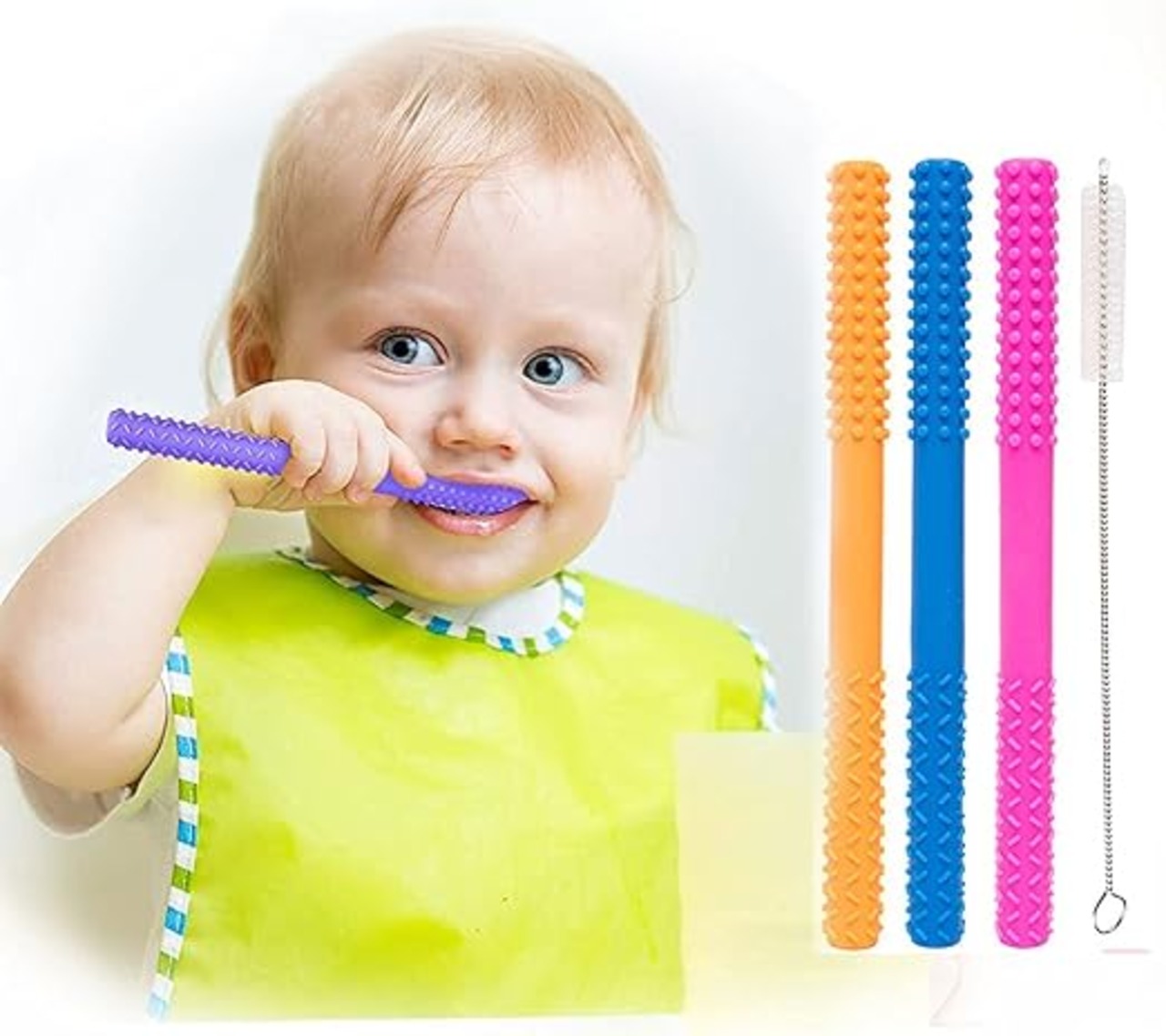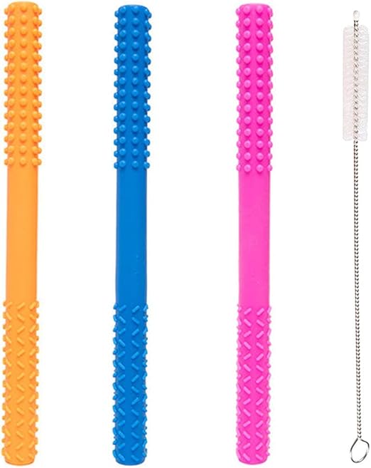 ベビー歯固め ストロー形状 歯痛みを和らげます 食品級シリコン 安全無毒 BPAフリー 3〜12ヶ月 新生児 おもちゃ-生産お祝い(3本のストロー+1本のクリーナーブラシ) a