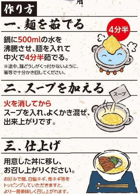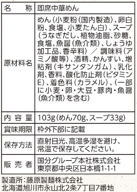 原材料:めん(小麦粉(国内製造)、卵白粉、食塩、小麦たん白)、スープ(うなぎだし、植物油脂、砂糖、食塩、魚醤(魚介類)、しょうゆ加工品、香辛料) / 調味料(アミノ酸等)、酒精、かんすい、増粘剤(キサンタンガム)、乳化剤、香料、酸化防止剤(ビタミンE)、着色料(カラメル)、(一部に小麦・卵・大豆・豚肉・魚醤(魚介類)を含む)