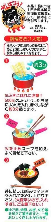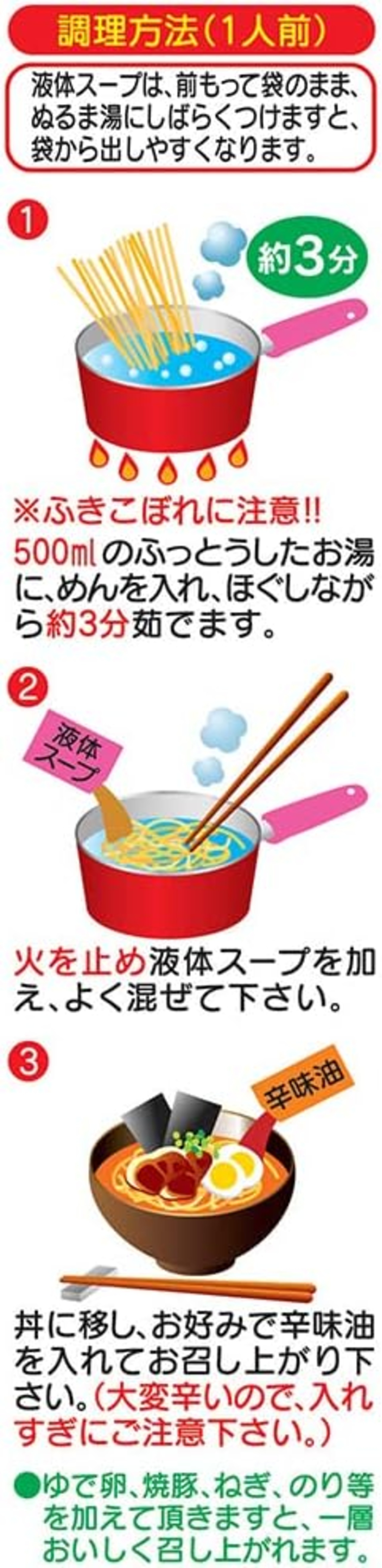 原材料:めん〔小麦粉(国内製造)、食塩〕、畜肉エキス(ポーク、チキン)、動植物油脂、しょうゆ、砂糖、食塩、野菜エキス、味噌、酵母エキス、香辛料、コチュジャン調味料、豆板醤、オイスターソース、蛋白加水分解物/調味料(アミノ酸等)、かんすい、香辛料抽出物、パプリカ色素、クチナシ色素、カラメル色素、酸化防止剤(ビタミンE)、(一部に小麦・乳成分・大豆・鶏肉・豚肉・牛肉・ごま・ゼラチンを含む)