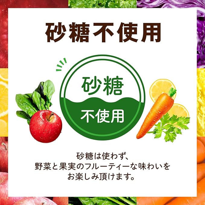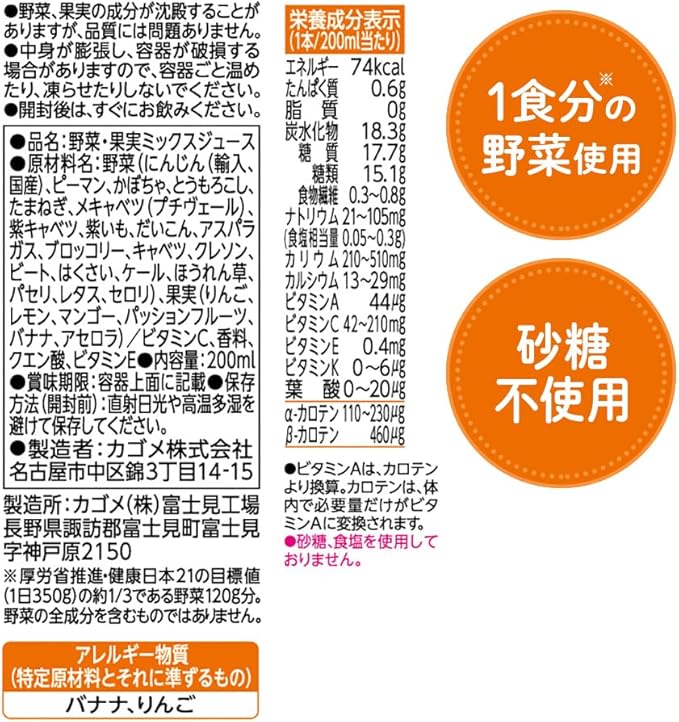 原材料:野菜(にんじん(輸入、国産)、ピーマン、かぼちゃ、とうもろこし、たまねぎ、メキャベツ(プチヴェール)、紫キャベツ、紫いも、だいこん、アスパラガス、ブロッコリー、キャベツ、クレソン、ビート、はくさい、ケール、ほうれん草、パセリ、レタス、セロリ)、果実(りんご、レモン、マンゴー、パッションフルーツ、バナナ、アセロラ)/ビタミンC、香料、クエン酸、ビタミンB2、ビタミンE