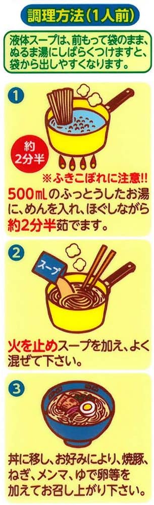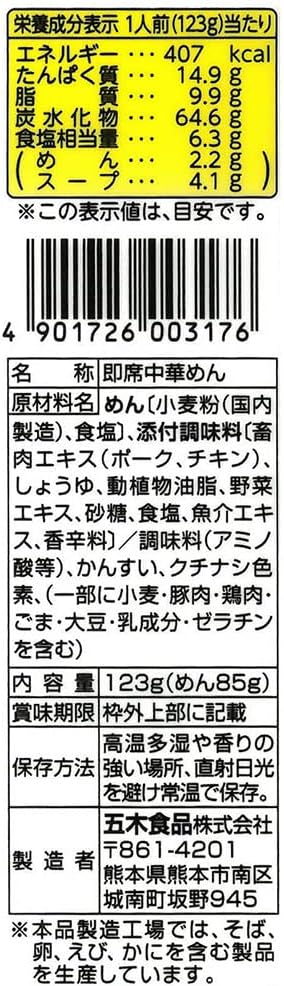 原材料:めん(小麦粉、食塩)、畜肉エキス(ポーク、チキン)、醤油、動植物油脂、野菜エキス、砂糖、食塩、魚介エキス、香辛料/調味料(アミノ酸等)、かんすい、クチナシ色素、(一部に小麦・豚肉・鶏肉・ごま・大豆・乳成分・ゼラチンを含む)