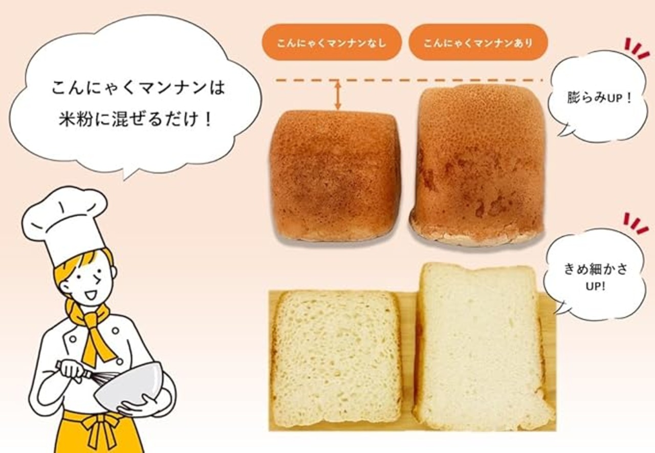 「こんにゃくマンナン」を米粉パンやケーキなどに加えるだけで、簡単にしっとり・もっちり・ふんわり感を付与することができます。しっとり感が持続するため、翌日でも美味しさが続きます。