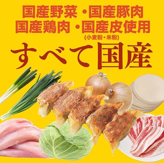 原材料:ぎょうざ [野菜(キャベツ(国産)、玉ねぎ、ねぎ、ニラ)、豚脂、食肉(鶏肉、豚肉)、しょうゆ、粒状大豆たん白、食用植物油脂、食塩、香辛料、皮(小麦粉、米粉、粉末状植物性たん白、食用植物油脂)/調味料(アミノ酸等)、乳化剤、増粘剤(グァーガム)] たれ[しょうゆ、醸造酢、みりん、ぶどう糖、食塩、砂糖/調味料(アミノ酸)、アルコール、カラメル色素] ラー油[食用植物油脂/香辛料抽出物、パプリカ色素]、(一部に小麦・乳成分・ごま・大豆・鶏肉・豚肉を含む)