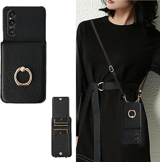 xperia 1 vi ケース ショルダー 可愛い エクスペリア1 vi ケース ショルダー 薄型 かわいい xperia1 vi ケース ショルダー ストラップ スマホケース 携帯ケース 背面カード収納 斜めかけ 肩掛け 首掛け 紐付き 韓国 軽量 ショルダーケース おしゃれ 2way ブラック a