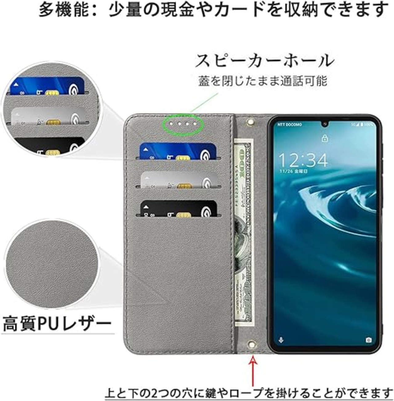 【対応機種】AQUOS Wish 5 スマホケース:独自の機械測定、キー対応。実用的な設計で、ケース装着時でも、カメラ、電源ボタン、音量ボタン、イヤホンジャック、コネクタ等が使用可能です。