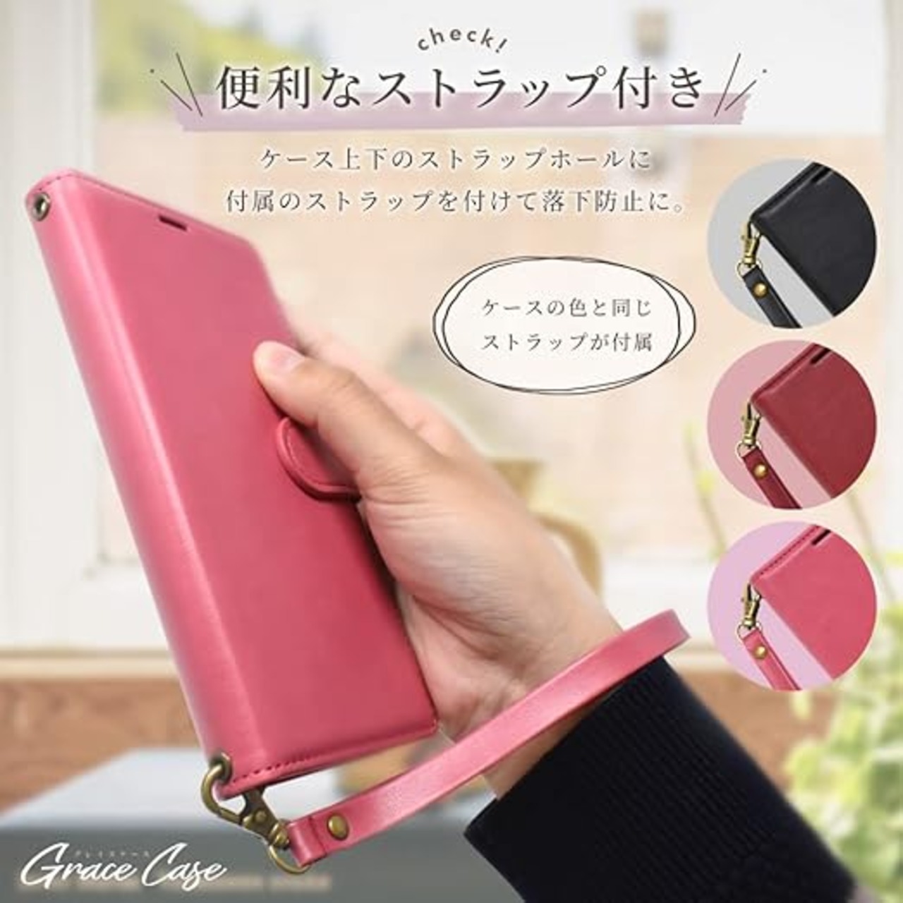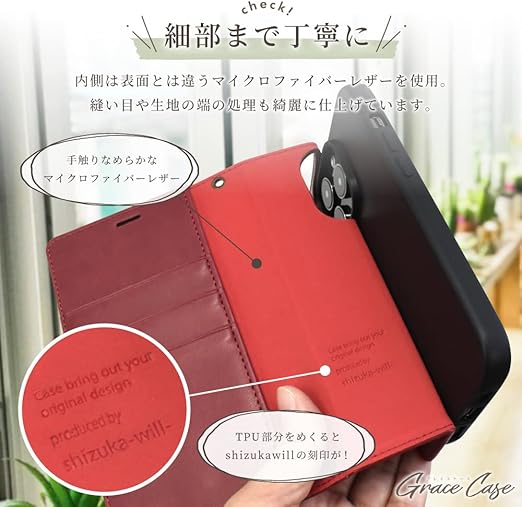 【グレイスケースの特徴】 外側はフェイクレザーを使用し、付属のストラップ , ストラップホールでビンテージ感を演出しています。 更に、清潔感と高級感を感じさせてくれるケースです。