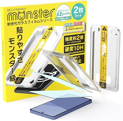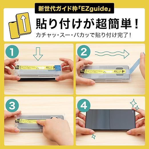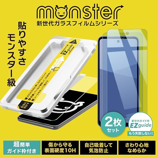 【カチャ、スー、パカッだけの簡単貼り付け】モンスターフィルムの「EZguide - イージーガイド - 」はガイド枠とガラスフィルムが一体型になった貼り付けキットです。画面にガイド枠をかぶせるだけで、誰でも簡単に位置ズレのなく貼り付けが可能です。今までの貼り付け方に戻れないほど「簡単」で「貼りやすい」EZguideをぜひお試しください。
