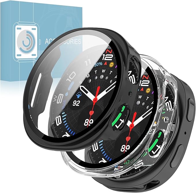 【2枚組】For Galaxy Watch 8 40mm 用 ケース ガラスフィルム 一体型 Galaxy Watch 8 保護カバー 全面保護 強化ガラス 耐衝撃 高透過率 指紋防止 スマートウォッチケース(ブラック+クリア) a