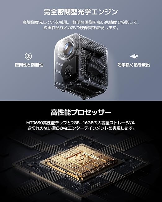 より良い視聴体験のための高解像度:1080p フルHDの鮮明な画像による再生をサポートします。完全密閉型光学エンジンで、高解像度光レンズを採用、鮮明な画像を高い色精度で投影して、映画作品などがもつ映像美を表現します。