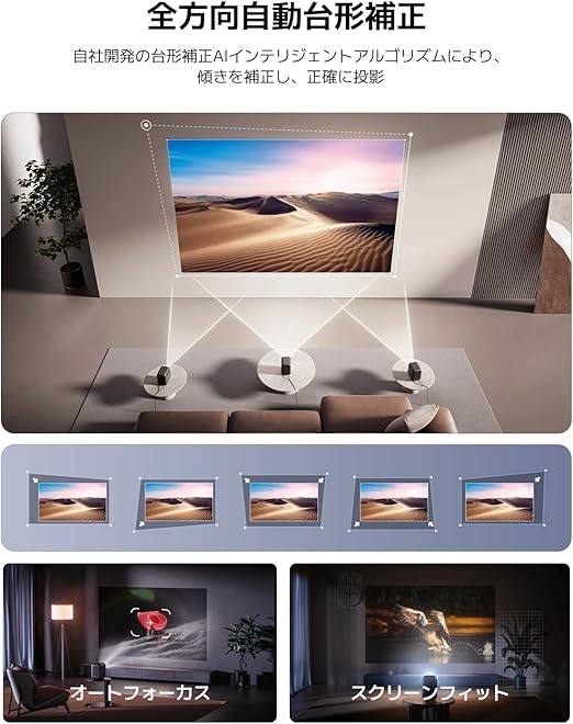 全方向自動台形補正:最大120インチの大画面に拡大でき、臨場感いっぱいの視
