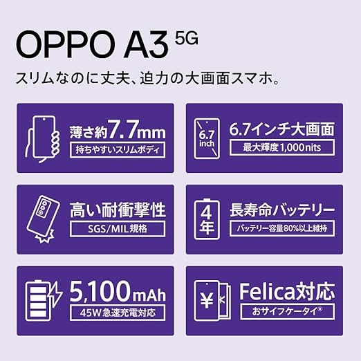 OPPO SIMフリー スマートフォン OPPO A3 5G スマホ 本体 日本語版 6.7インチ 液晶ディスプレイ 5000万画素 120Hz 5100mAh大容量バッテリー 45W急速充電 docomo/au/SoftBank/Rakuten Mobile 回線対応 携帯電話 FeliCa対応 側面指紋認証 顔認証 技適認証済 4GB RAM 8GB拡張可能+128GB ROM 1TB拡張可能 a