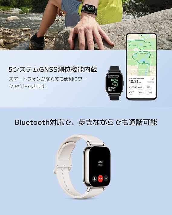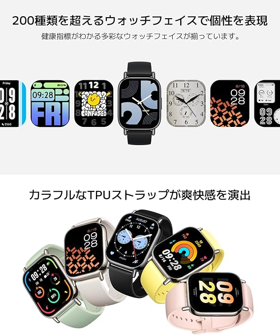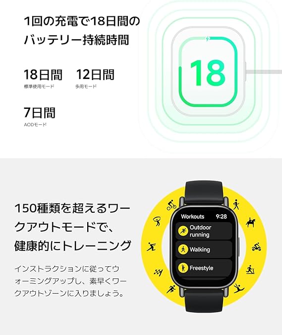 【1.96インチの大型有機ELディスプレイ】1.96インチの鮮明な有機ELディスプレイで、豊かで自然な色を再現。ディスプレイは75.8%の画面占有率を誇ります。AOD(常時画面表示)機能にも対応しており、一日中質の高い体験を提供します。スクエアディスプレイは、光沢度の高いNCVMミドルフレームを使用し、スタイリッシュで軽量設計でワークアウトにぴったりです。