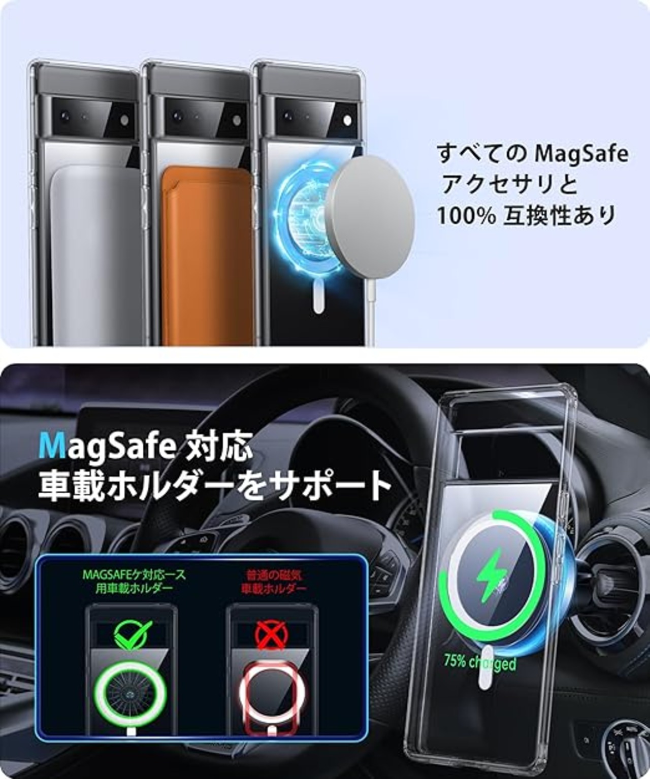 【MagSafeアクセサリとの互換性】正確に内蔵された強力なN52磁石により、強力な取り付け体験とより高速なワイヤレス充電が提供されます。 ケースを外すことなく、MagSafe または Qi 充電器で Google Pixel 6 Pro ケース を充電できるため、非常に便利です。暖かいリマインダー: すべての MagSafe 電話ケースは MAGSAFE 専用磁気カー マウントと併用する必要があり、通常の磁気カー マウントとは互換性がありません (磁気接着領域が小さいため、MagSafe 磁気