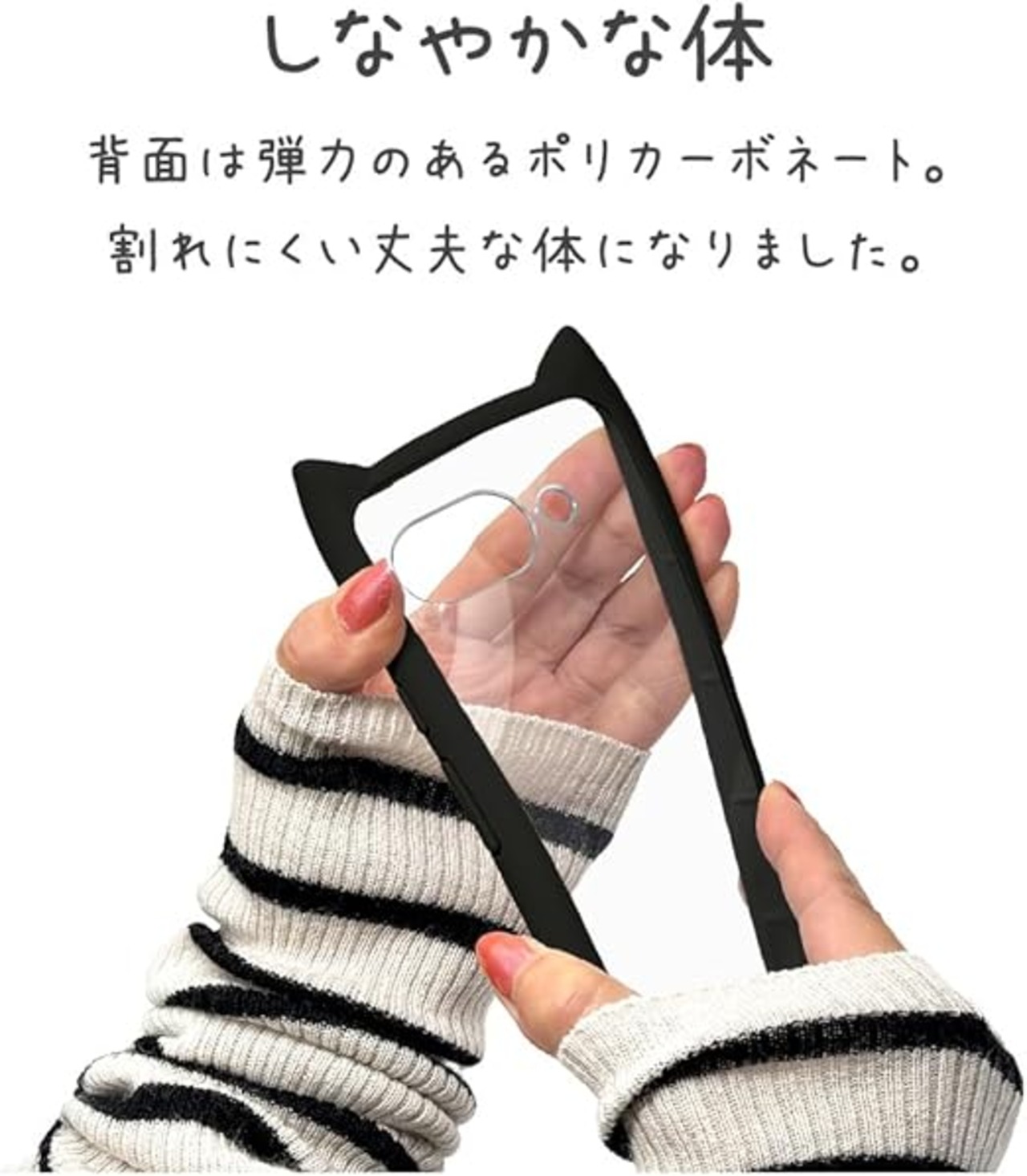 【ねこ耳が付いてカワイイ】さりげなくネコの耳をデザインした可愛く個性的なスマホケースです。また、ケース背面がクリア(透明)だから、端末色を活かしたりお好きなシールやステッカー等を入れて、自分らしくカスタマイズできます。
