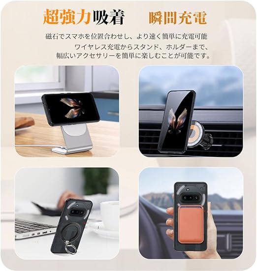 【強力な磁力吸着】ケース背面にマグネットを内蔵しているので、スマホをすべてのMagSafeアクセサリーにしっかりと吸着させます。また、すべての MagSafeアクセサリ(ウォレット、リングホルダー、パワー バン