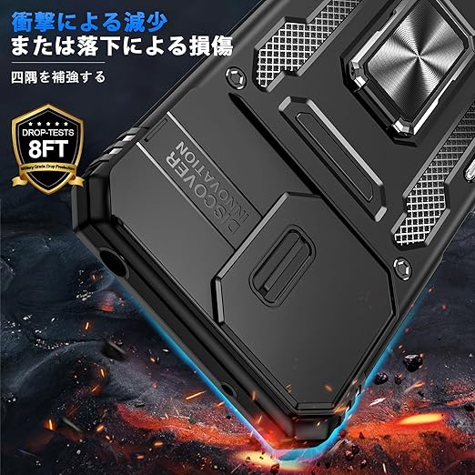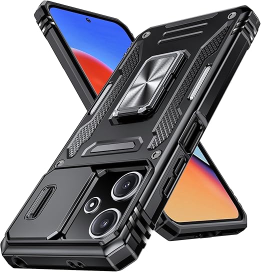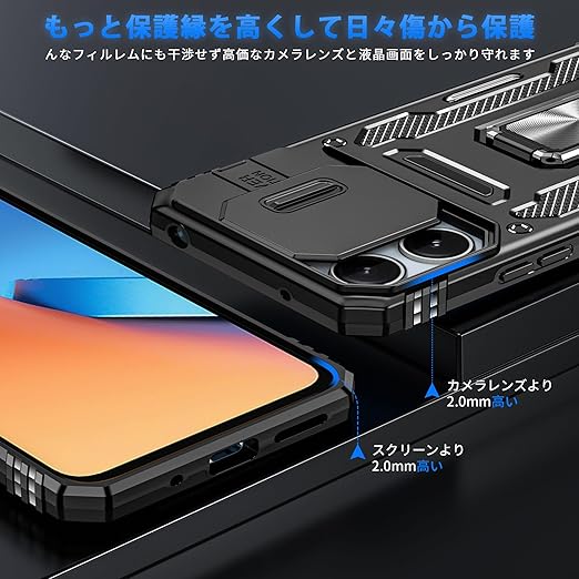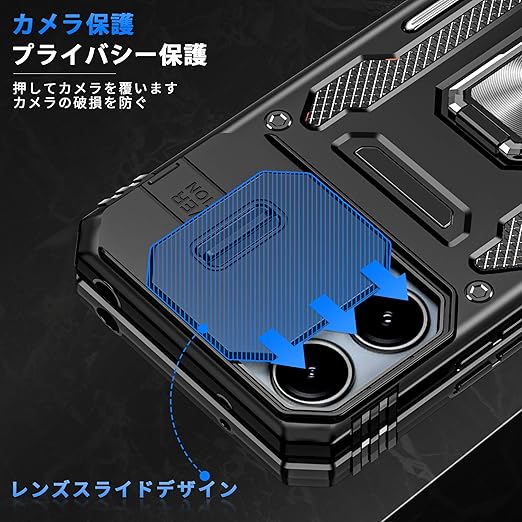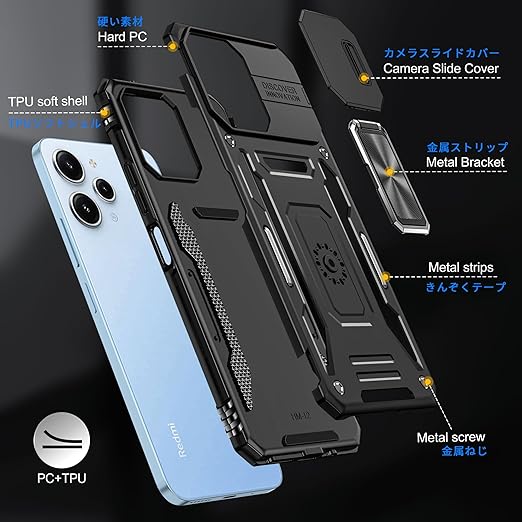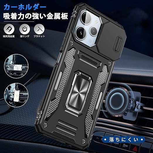 Xiaomi Redmi 12 5G/4G/ ケース Redmi Note 12R ケース リング付き スライド式カメラプロテクター付き 衝撃吸収 保護ケース PC スタンド機能 車載ホルダー対応 米軍MIL規格 金属リング 擦り傷防止 滑り止め Redmi 12 5G/4G/Note 12R カバー 耐衝撃 横置き機能 人気 黒 C92-hm12 5g-01 a