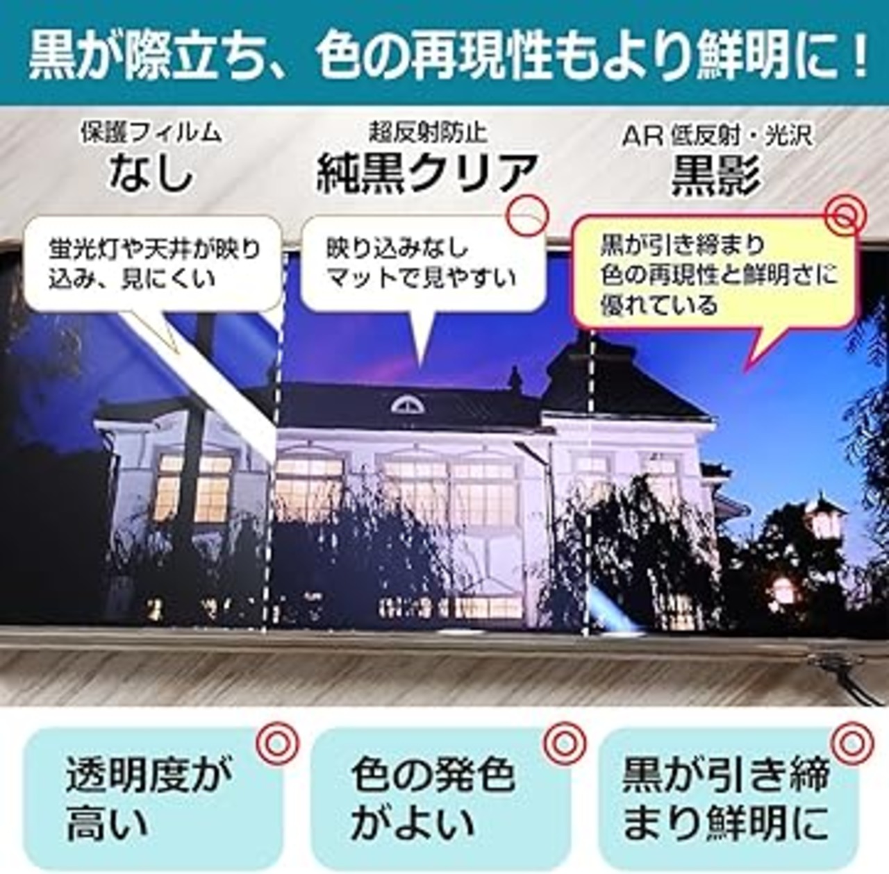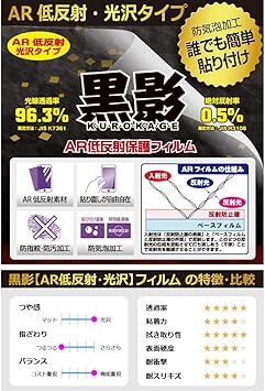 黒影【AR低反射・光沢】フィルムは、通常フィルムとは異なり、光学的に映り込みを抑制するフィルムです。反射率が驚異の0.5%と、光沢なのに低反射を実現! 高い透明度・透過率で、白くならず黒が引き締まり、色の再現性や視認性に優