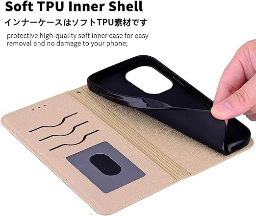 【特徴1:高品質PUレザー】軽量化のスマホケースです。外側カバーには滑り止めのライチ模様のPUレザーを採用します。内側のホルダーは柔軟なTPU素材を採用したソフトケースです。汚れにくくて指紋防止の特徴を持っております。耐衝撃の二重構造で落下の衝撃をうまく吸収します、本体をしっかりと守ります。