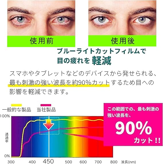 【ご注意事項】:ブルーライトカット技術が採用されているため、室内の光が弱い場所ではブルーライトフィルムの色がほとんど確認できません。そのため、日光の下でフィルムの色を確認することをお勧めします。日光の下では色がよりはっきりと見え