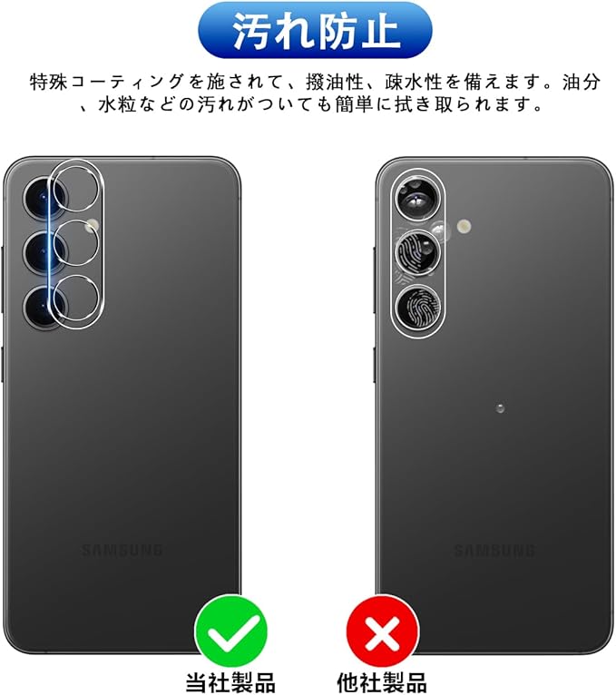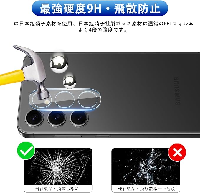 【飛散防止可能の9H硬度】 対応 ギャラクシーS24 5G レンズフィルム カメラ保護フィルムはす旭硝子で作られており、レンズ保護フィルムの中で最高レベルの9H硬度に達しています。手にフィットして持ちやすく滑りにくいので落ちにくいです。万が一落ちてもカメラフィルムが衝撃を吸収してくれるので、レンズ損傷を最低限まで抑えられます。また、特殊な飛散防止設計により、ガラスが割れても