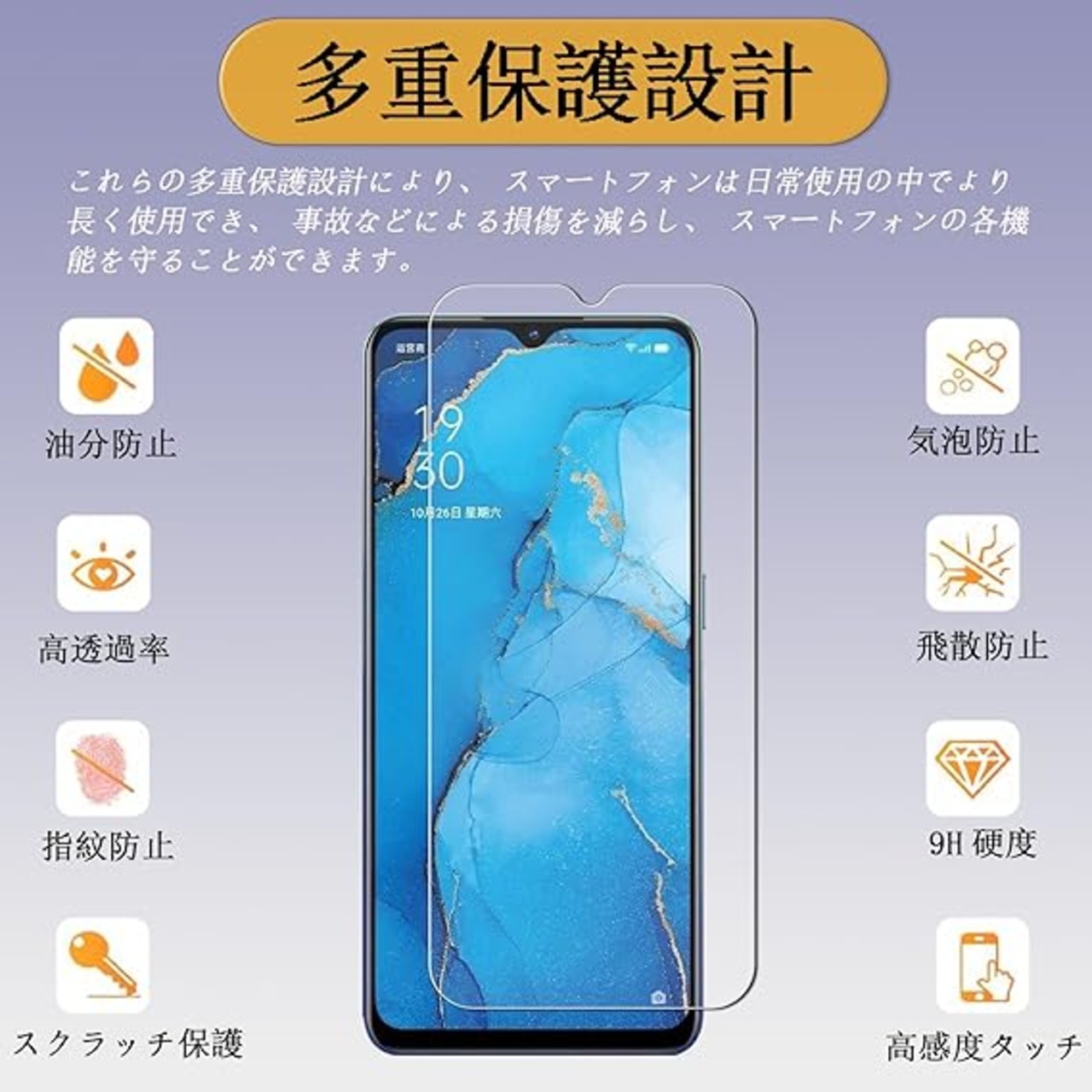 【日本製素材旭硝子製・耐衝撃性】:日本製旭硝子素材、9H硬度、またハードコーティング技術により、強度を普通より3倍以上アップしており、液晶画面をしっかりと保護する。ハードコーティング技術により外部からの衝撃をフィルムが吸収し、画面へのダメージを最低限まで抑えます
